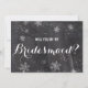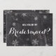 Moderne Winterschneeflocken-Tafel Werden Sie meine Bridesmädchenkarte. Stilvolle, elegante und originelle schwarze Tafel mit weißem Schneeflocken. Ein elegantes Schwarz-Weiß-Hochzeitsthema perfekt für Winterwunderland, Weihnachts-Hochzeitsthema.Der Text ist vollständig anpassbar