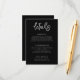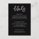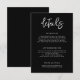 Diese zeitgenössische Hochzeitskunstkarte zeichnet sich durch ein minimalistisches Schwarz-Weiß-Design mit dekorativem Schriftart aus. Die Informationen werden in den Abschnitten für den Transport und die Unterbringung deutlich angezeigt. Eine Website-Adresse ist auch am unteren Rand für weitere Details enthalten.