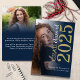 Moderne 2 Foto Navy Blue Gold 2025 Abschluss Ankündigung. Eine stilvolle Typografie und Foto-Design, um die Neuigkeiten Ihres High School Senior Absolventen bekannt zu geben, mit kühnen großen Typografie gedreht und auf der rechten Seite oben in weiß und gold. Personalisieren Sie einfach die Erholung des Textes mit Ihrer Nachricht auf der Rückseite. Ersetzen Sie die Fotos in den Vorlagen auf jeder Seite durch Ihre eigene.