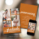 Fügen Sie Ihre Lieblings-Vier-Fotos an die Vorderseite dieser Abschlussfeier-Ankündigungen mit AbsolventInnen und Klasse der schicken Schrift auf einem verbrannten orangen Hintergrund. Weitere Designs und Farben in unserem Shop, einschließlich Einladungen, speichern Sie die Datumskarten und Postkarten.