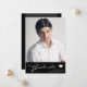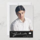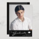 Phantastische Abschluss-Ankündigungskarte mit Designelementen moderner Texte, die mit elegantem Kalligrafieschrift verschmolzen sind. Das Foto der Absolventen hebt die Kartenvorderseite hervor, während auf der Kartenrückseite personalisierte Textstellen für Informationen über den Abschluss und die künftige Reise angeboten werden. Die Hintergründe sind schwarz mit einem dünnen Farbverlauf auf der Vorderseite und die Regalfarben grau und schwarz auf der Rückseite. Um mehr zu sehen, besuchen Sie meinen Shop hier unter "www.Zazzle.com/LakeViewCardCo". Danke