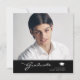 Phantastische Quadrat-Abschluss-Ankündigungskarte mit Designelementen moderner Texte, die mit elegantem Kalligrafieschreiben verschmolzen sind. Das Foto der Absolventen hebt die Kartenvorderseite hervor, während auf der Kartenrückseite personalisierte Textstellen für Informationen über den Abschluss und die künftige Reise angeboten werden. Die Hintergründe sind schwarz mit einem dünnen Farbverlauf auf der Vorderseite und die Regalfarben grau und schwarz auf der Rückseite. Um mehr zu sehen, besuchen Sie meinen Shop hier unter "www.Zazzle.com/LakeViewCardCo". Danke