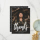 Trendy Abschluss Dankeschön Karten mit dem Foto des Absolventen mit "Dank" in der weißen Schrift Schrift. Personalisieren Sie die Vorderseite der Karte, indem Sie den Namen des Absolventen und Abschluss Jahr. Der Foto Abschluss Dankeschön-Karte kehrt zurück, um Ihre getippte oder handgeschriebene Nachricht mit einem schwarz-weißen Sprinkle Hintergrund anzuzeigen.