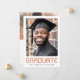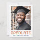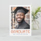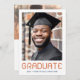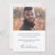 Moderne Abschluss-Ankündigungskarte mit Ihrem Foto und dem Text "Absolvent" in einem modernen Schriftart mit dem Jahr und Schulname unten. Zusätzliche Foto und benutzerdefinierte Dankeschön-Nachricht auf der Rückseite. Dunkelblauer Text auf weißem Hintergrund.