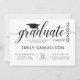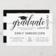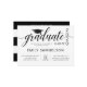 Moderne Graduiertenparty, Feierlichkeiten mit Schwarz-Weiß-Einladungen. Trendy Drehbücher GRADUATE mit Graduationsmütze, Mörtel, akademischen Quadrat oder Oxford Mütze. Auf der Kartenrückseite können Sie den Schulnamen hinzufügen. Einfach bearbeitbare Karten - einfach Ihren Text hinzufügen. Alle Texte können geändert werden: Farbe, Größe, Schriftart