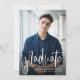 Feiern Sie Ihren Uni- oder Highschool-Abschluss mit dieser vertikalen Ankündigung mit zwei Fotos, die auch Platz auf der Rückseite für Abschlussfeier Einladungstext enthält. Das moderne Drehbuch "graduate" auf der Vorderseite in Weiß ist perfekt für einen trendigen Abschluss. Der Backer ist schwarz mit einem subtilen Muster und einem zweiten Foto. Der Text auf der Rückseite kann für die Details der Graduiertengruppe, die Leistungen des Absolventen oder zukünftige Pläne angepasst werden. Diese stilvolle, aber einfache Ankündigung und Einladung von Abschlüssen funktioniert gut für Absolventen der High School oder Uni und ist auch als Ankündigung und Einladung Download verfügbar. In der Kollektion von Lea Delaveris Design finden Sie weitere Farben und Stile sowie Graduiertendekoration.