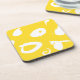 Dieser moderne, akrilische Untersetzer ist mit weißen Flecken und grafischen Gesten auf einem schlichten, gelb-orangefarbenen Hintergrund gestaltet.