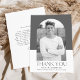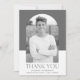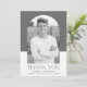 Einfache und stilvolle Abschluss Dankeschön-Karte mit dem Foto des Absolventen in einem Bogenrahmen mit grauem und weißem Blockhintergrund. "Danke" wird in grauer, moderner Schrift mit dem Namen, der Schule und dem Abschluss des Absolventen angezeigt, wie unten gezeigt. Der Foto Abschluss Dankeschön-Karte kehrt zurück, um Ihre getippte oder handgeschriebene Nachricht anzuzeigen.