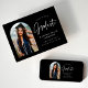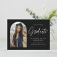 Trendy Abschluss Ankündigung mit dem Foto des Absolventen gerahmt von einem schwarzen Bogen mit "Graduate" in einem weißen handgeschriebenen Skript. Personalisieren Sie die Vorderseite der Erzankündigungskarte, indem Sie den Namen des Absolventen, das Abschluss Jahr, den Schulnamen und die Zukunftspläne hinzufügen. Die Ankündigung des Foto Abschlusses kehrt zurück, um ein schwarz-weißes gepunktetes Muster anzuzeigen. Die Ankündigung eignet sich sowohl für Absolventen der Highschool als auch für Absolventen der Uni.