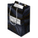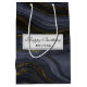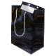 Geburtstagsgeschenktasche mit einem schönen Bild von dunklem abstraktem Agrostein. Farben schwingen in Wellen. Die Hauptfarben sind schwarz, blau-grau und ein Imitat-Gold Band, das durch das Design läuft. Modern und trendig.