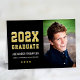 Moderne Abschluss-Ankündigung und Dankeschön-Karte zeichnet sich durch ein einfaches und männliches Design mit Sport Jersey inspirierte Schrift aus, perfekt für Ihren All-Star-Student und Varsity-Athlet. Die Farben Schwarz, Gold und Weiß können komplett angepasst werden. Fügen Sie ein Senior-Portrait oder Abschluss / Party-Foto.