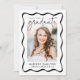 Feiern Sie Ihren Meilenstein mit dieser Ankündigung des modernen Black Wavy Frame Abschlusses mit einem eleganten und stilvollen Design. Die Vorderseite zeigt ein vertikal abgestuftes Foto, das durch einen schwarzen, gewellten Rahmen gerahmt ist, wobei "Graduate" elegant in einem handgeschriebenen schwarzen Skript auf einem knusprigen, weißen Hintergrund dargestellt wird. Personalisieren Sie es mit Ihrem Namen, Abschluss Jahr und Schule für eine einzigartige Touch. Die Rückseite der Ankündigung hebt ein horizontales Foto mit Platz für eine benutzerdefinierte Nachricht hervor, sodass Sie Ihre Begeisterung und Ihre Zukunftspläne teilen können. Dieses moderne und zeitlose Design eignet sich perfekt für Absolventen der Highschool und der Uni und ist ein unvergessliches Erlebnis für Familien und Freunde.