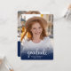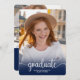 Feiern Sie den Absolventen stilvoll mit dieser schicken und modernen Abschluss-Einladung. Mit einem ganzseitigen Portrait auf der Vorderseite mit eleganter Schrift-Typografie behalte dieses Design es einfach und stilvoll. Der Rücken zeigt eine Collage von drei weiteren Fotos, die sich perfekt für besondere Momente eignen. Mit klaren Linien und einem zeitlosen, weißen Hintergrund ist diese Einladung ideal für Highschool oder Uni-Abschlüsse. Personalisieren Sie die Details, um es einzigartig zu machen! Weiß auf marineblau.