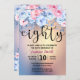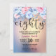 Schöne moderne 80. Geburtstag Einladung. Gestaltungselemente aus Aquarellhintergrund mit goldenem Glitzer und Blumenelementen in Rosa und Blau.
