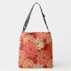 Modernes Nehmen auf einer traditionellen japanischen Blumenkimonodruck-Drucktasche - stylized Blumen in den Schatten des Pastells zur tiefen Orange auf einem tiefen Mandarinehintergrund