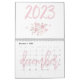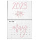 Moderner Mauerkalender 2023 mit schönen Abbildungen von Rose und rosa Schriftzeichen, die im Kalender geschrieben sind.