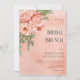 Dieses Brautparty-Brunch-Einladung-Design verfügt über eine große Ecke Blüte von Pfirsich und Korallen Blume ergänzt durch Grün. Das Design wird auf einem pfirsichfarbenen Vintagen Hintergrund angezeigt. Erstellt von der einfachen Farmhouse Press.