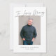 Diese wunderschöne Gedenkkarte besticht durch einen klassischen, weißen Hintergrund, ein vertikales Foto und eine moderne und dennoch elegante Typografie. Das Skript auf der Vorderseite sagt "In Loving Memory". Mit dem Editierwerkzeug kann man eine persönliche Nachricht oder ein Foto auf der Rückseite hinzufügen.