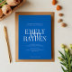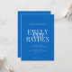 Die Einladung zur Hochzeit zeichnet sich durch ein minimalistisches Design mit einem saphir blauen Hintergrund und einer sauberen, symmetrischen Anordnung aus. Es verwendet elegante Serif-Schriftart, wobei die Namen des Ehepaares in einem großen, überlappenden Text für eine kühne und moderne Touch hervorgehoben dargestellt werden. Die übrigen Details sind in einem kleineren, klaren Schriftart angeordnet, wobei die Einfachheit und Eleganz gewahrt bleiben und zeitgenössische und traditionelle Ästhetik kombiniert werden.