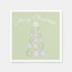 Dieses Papier Serviette Design verfügt über drei nicht-traditionelle Farbe Weihnachtsschmuck in Pastellgrün, Rosa und Blau mit weißen Sternen. Die Ornamente werden gestapelt und gestaffelt, um eine Weihnachtsbaumform auf grünem Hintergrund zu bilden. Verlass den Vorlagentext "Frohe Weihnachten" so, wie er ist, personalisiere ihn oder entferne ihn ganz.