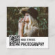 Auf diesen modernen Visitenkarten für Fotografen oder Fotografen wird ein Lieblingsfoto gezeigt. Das Design umfasst zwei Zeilen benutzerdefinierten Textes unter Ihrem Foto sowie einen anpassbaren QR-Code. Füge deine vollständigen Kontaktdaten auf der Rückseite in knackiger, moderner schwarzer Schrift hinzu.