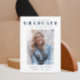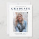 Eine einfache, saubere Foto-Abschluss-Ankündigung mit Einladungsdetails auf der Rückseite. Dieses Design verfügt über einen großen Graduiertentyp und Studentennamen über einem Portrait-Foto des Abschlusses.