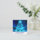 Visitenkarten mit einem modernen elektrischen blauen Weihnachtsbaum. Das Ganze ist mit Lichtern geschmückt. Der Hintergrund ist verschwommen.