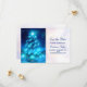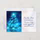 Eine Save the Date flache Karte mit einem modernen blauen Weihnachtsbaum. Das Ganze ist mit Lichtern geschmückt. Der Hintergrund ist verschwommen.