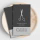 Moderne Visitenkartenvorlage mit dunkelgrauem und silberfarbenem Streifenhintergrund und Schere. Einfaches und elegantes Design. Ideal für Haarstylisten, Schönheitssalon.