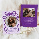Mit dieser eleganten Ankündigung des Abschlusses feiern Sie die Errungenschaft Ihres Absolventen mit einem kühnen lila Bogen- und Band-Design auf einem lila Hintergrund. Das zirkuläre Foto des Absolventen wird durch den Bogen wunderschön gerahmt, während "Graduate" in einem stilvollen, handgeschriebenen lila Drehbuch gezeigt wird. Personalisieren Sie mit dem Namen, der Schule und dem Abschluss Jahr für eine einzigartige und sinnvolle Touch. Auf der Rückseite finden Sie ein zusätzliches Foto und Platz für eine individuelle Botschaft, wodurch sich dieses Design perfekt für Absolventen der Highschool und der Uni eignet. Teilen Sie diesen besonderen Meilenstein mit einem raffinierten und zeitlosen Sake!