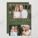 Elegantes Multi-Foto Save the Date mit "Save the Date" in weißer Schrift mit olivgrünem Hintergrund. Personalisieren Sie die moderne QR Save the Date-Karte mit 3 Ihrer Lieblings-Fotos, Ihren Namen, Ihrem Hochzeitstag und Ihrem Hochzeitsort. Das olivgrüne Save the Date kehrt zurück, um Ihren individuellen QR-Code mit Hochzeitswebsite und individuellem Text anzuzeigen.