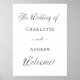 Ein weißer Hintergrund. Mit dem Text: Willkommen bei der Hochzeit von. und Willkommen" Personalisieren und fügen Sie Ihre Namen. Schwarzer Text.