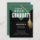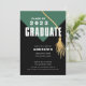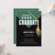 Moderne & kühne Klasse der 2022 Graduierungsparty Einladung mit einem grünen Gradmütze mit einem goldenen Tassel-Set auf schwarzem Hintergrund. Besuchen Sie unseren Shop, um dieses Design in einer Vielzahl von Schulfarben zu sehen.