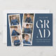 Trendy Graduation Ankündigungen mit einem Filmstreifen mit 6 quadratischen Fotos des Absolventen. "Grad" wird in weißer, moderner Schrift mit marineblau Hintergrund (bearbeitbare Farbe) angezeigt. Personalisieren Sie die Titelseite der Ankündigung eines Abschlusses mit mehreren Fotos, indem Sie den Namen des Absolventen, den Namen der Schule und das Jahr des Abschlusses hinzufügen. Die Ankündigung kehrt zurück, um zusätzliche Texte wie Abschluss-Details, Zukunftspläne, Party-Informationen, etc. anzuzeigen. Die stilvolle Abschluss-Ankündigung ist ideal für Absolventen der Highschool und der Uni.