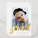 Moderne Foto Abschluss Gold Foil Einladung Ankündigung. Personalisieren Sie es mit Ihren Fotos und dem Namen des Absolventen, Schulname und Abschluss Jahr. Ersetzen Sie den Info-Text des Grads auf der Rückseite durch Ihre Daten oder geben Sie Ihren eigenen personalisierten Text ein. Eine moderne und elegante Abschluss Foto-Anzeigenkarte mit echtem Goldfolientext. Eine tolle Möglichkeit, Ihre Highschool- oder Uni-Leistungen mit Ihrer Familie und Freunden zu teilen.