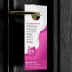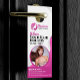 Lassen Sie Ihren Salon mit dieser lebendigen und modernen Door Hanger Vorlage auffallen. Das auffallende rosa Design und die übersichtliche Gestaltung sind perfekt für die Präsentation Ihrer Haar- und Schönheitsleistungen. Personalisieren Sie es einfach mit Ihren Daten und beobachten Sie Ihre Kundschaft wachsen!