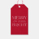 Moderne Weihnachtsgeschenke mit "Merry and Bright" in weißer Schrift und rotem Hintergrund mit subtilen weißen Punkten. Personalisieren Sie die roten Geschenketiketten mit Ihrem individuellen Gruß und Familiennamen.