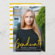 Stilvolle, moderne Ankündigung des Abschlusses mit dem senkrechten Foto des Absolventen mit "Graduate" in einem gelben Pinsel-Script-Schriftart. Personalisieren Sie die Ankündigung des Foto-Abschlusses, indem Sie den Namen des Absolventen, den Schulnamen und das Abschluss Jahr. Die trendige Ankündigung des Abschlusses zeigt ein gelb-weiß gestreiftes Muster.