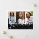 Eine einfache moderne Karte, um einen Abschluss anzukündigen. Auf der Vorderseite befindet sich GRADUATE in einem Schriftart mit weißem Skript. Personalisieren Sie mit einer 3-Foto-Collage und dem Namen der Absolventen, geschlossen Jahr und Schule. Die Rückseite bietet die Möglichkeit, sich mit Ihrer eigenen persönlichen Nachricht zu personalisieren, oder Sie können alle Texte löschen, um leer verlassen.