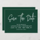 Moderne Kalligraphie Save the Date in smaragdgrün mit einem digitalen, scannbaren QR-Code für eine Website oder Kontaktinformationen auf der Rückseite.