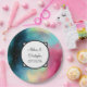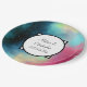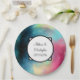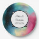 Hochzeitsveranstaltung personalisierte Papier-Teller mit einem coolen und stilvollen abstrakten Design. Wasserfarben mischen sich und mischen sich, um die Illusion eines Raumbildes zu schaffen. Grün mit lila, gelben und hellroten Wirbel und einer Mischung aus weißen Punkten und Sternen. Eine elegante künstlerische Schöpfung.