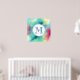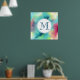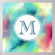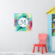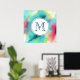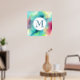 Ein Plakat mit einem coolen und stilvollen abstrakten Design. Wasserfarben mischen sich und mischen sich, um die Illusion eines Raumbildes zu schaffen. Grün mit lila, gelben und hellroten Wirbel und einer Mischung aus weißen Punkten und Sternen. Eine elegante künstlerische Schöpfung. Ein weißer Kreis überlagert mit einem Monogramm, das innen anfänglich eingeprägt ist.