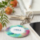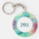 Ein Schlüsselanhänger mit einem coolen und stilvollen abstrakten Design. Wasserfarben mischen sich und mischen sich, um die Illusion eines Raumbildes zu schaffen. Grün mit lila, gelben und hellroten Wirbel und einer Mischung aus weißen Punkten und Sternen. Eine elegante künstlerische Schöpfung. Ein weißer Kreis lag oben mit deinem Namen innen.