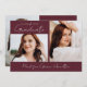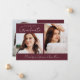 Mit dieser stilvollen, modernen Ankündigung des Foto Abschlusses verkünden Sie die Leistungen und Pläne Ihres Absolventen. Auf der Vorderseite der Ankündigung werden 2 Fotos angezeigt - 1 waagerechtes und 1 vertikales Foto. "Graduate" wird in einem trendigen, handgeschriebenen weißen Skript mit einem Hintergrund aus Maronen angezeigt. Personalisieren Sie die Ankündigung des Maroon-Abschlusses mit dem Jahr und dem Namen des Absolventen. Die Ankündigung kehrt zurück, um ein zusätzliches Foto mit Ihrem eigenen Text in weißer Schrift anzuzeigen. Diese 3 Foto Abschluss Ankündigung ist ideal für High School oder Uni-Abschlüsse.