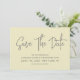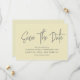 Moderne Kalligraphie Save the Date in hellgelb mit grauem Text und einem digitalen QR-Code für eine Website oder Kontaktinformationen auf der Rückseite.