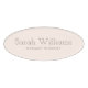 Moderne, trendige Namensschilder mit Namen und Titel, die auf einem hellblütigen rosa Hintergrund in Braun gedruckt sind.