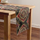 Ein ausgesprochen gemusterter Tischläufer schmückt anmutig einen eleganten, modernen Esstisch. Die luxuriöse Einrichtung mit ihren aufwändigen, bunten Designs verleiht einem ansonsten zeitgenössischen Ambiente eine Touch von Eleganz und Charme und eignet sich perfekt für Hochzeitsfeiern.