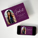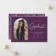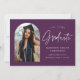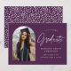 Trendy Abschluss Ankündigung mit dem Foto des Absolventen gerahmt durch einen lila Bogen mit "Graduate" in einer weißen handgeschriebenen Skript. Personalisieren Sie die Vorderseite der Erzankündigungskarte, indem Sie den Namen des Absolventen, das Abschluss Jahr, den Schulnamen und die Zukunftspläne hinzufügen. Die Ankündigung des Foto Abschlusses kehrt zurück, um ein lila, weiß gepunktetes Muster anzuzeigen. Die Ankündigung eignet sich sowohl für Absolventen der Highschool als auch für Absolventen der Uni.