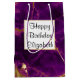 Eine Geschenktasche mit einem abstrakten Muster und einem Marmordesign. Reiche lila Farbkombinationen, kombiniert mit Imitat-Gold schwirbelnden Farbbändern, die das gesamte Design durchziehen. Ein Quadrat mit einem goldgedeckten Imitat-Rahmen überlagert mit dem personalisierten Text im Inneren.