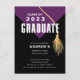 Modern & fett Klasse 2022 Graduiertenparty Einladung mit einem lila Gradcap mit Goldtassel-Set auf schwarzem Hintergrund. Besuchen Sie unseren Shop, um dieses Design in einer Vielzahl von Schulfarben zu sehen.